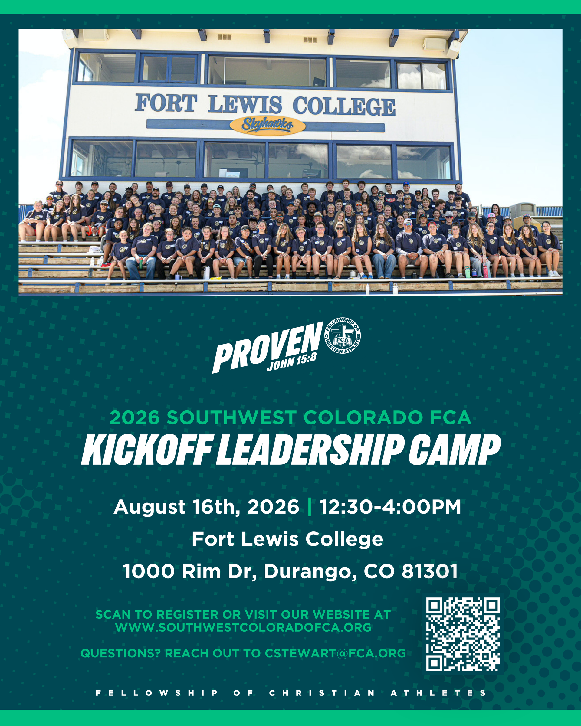 The 2026 Southwest Colorado FCA Leadership Camp is a mandatory FCA leader training for all Southwest Colorado FCA student leaders and huddle leaders. Expect a day of fellowship, prayer, lunch, competition, & planning time for prepping for the new school year!